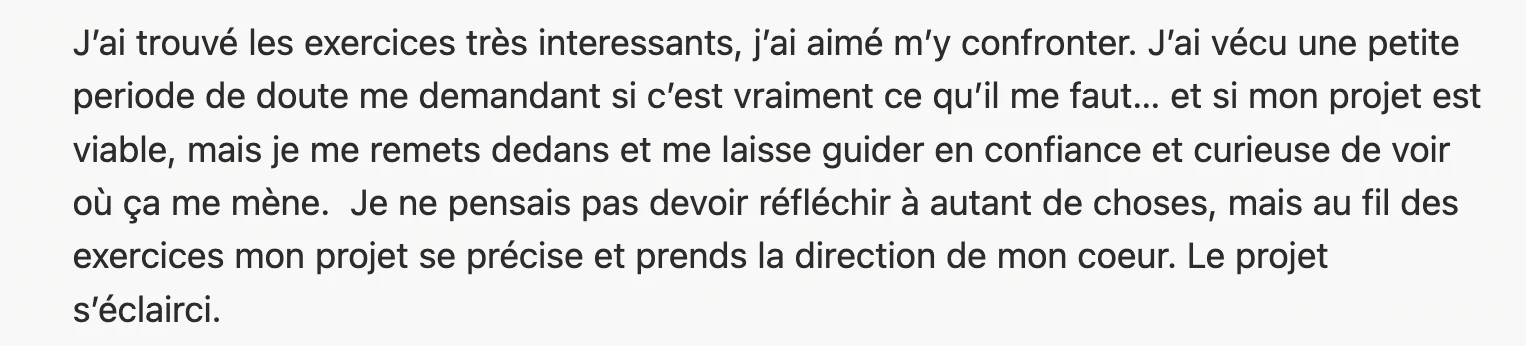 On clarifie ton projet de cœur ensemble: qui tu es, ce qui te rend unique, ton message profond, ce que tu veux réellement pour ton mode de vie (loin des injonctions de l’entrepreneuriat).