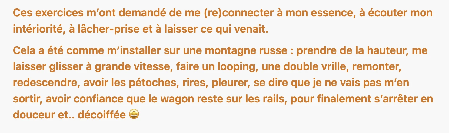 Parce que l’aventure ne s’arrête pas à la livraison 🙂 Je reste à ton écoute sur WhatsApp pour t’accompagner dans ta prochaine étape (lancement, transition stratégique) et toutes les émotions et questions qui vont avec! Afin de cultiver la joie et la confiance sur le long terme.