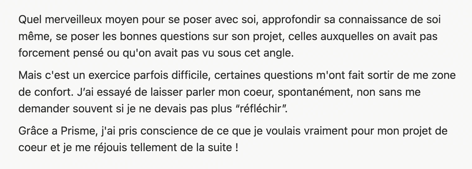 Prisme est spécifiquement développée pour les indépendant·es qui se lancent / dont l’entreprise évolue. Comme on va fouiller en profondeur, on ressort en principe avec des éléments prêts à t’accompagner sur la durée (tes valeurs, ton message, etc.)