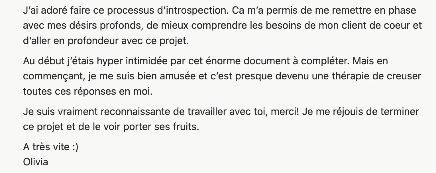 → Je reste à ta disposition pour répondre à tes questions et t’aider dans ton lancement / ta refonte à travers un suivi par Whatsapp et un rendez-vous bilan pour poser les prochaines étapes stratégiques à tes côtés.